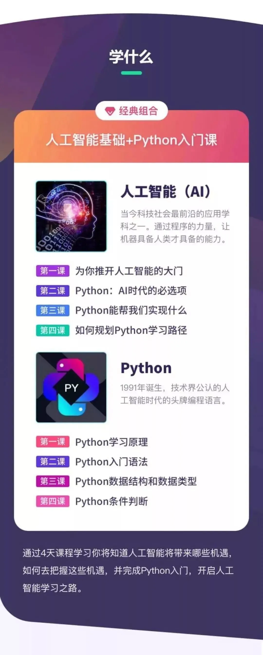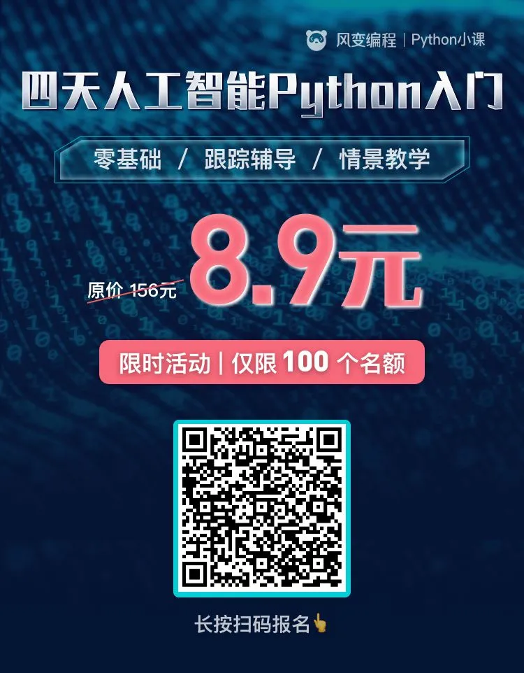 这次我与python小课(风变编程)合作了「四天人工智能Python入门」,为小伙伴们争取到100个限时优惠名额。想参加的小伙伴可以立刻抢购喔,据说每天上课的班级都爆满,先报先占位 !