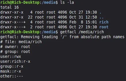 这个目录是windows分区,只有rich可以进入。 看似rich没有权限,+代表使用了访问控制列表 (ACL) 的机制,getfacl命令查看 “白名单”,可以看见rich被特许进入权限: