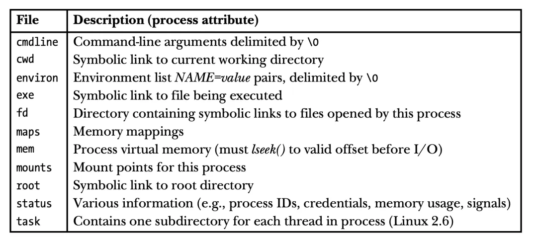 这个信息的使用场景比较有限, 一方面是因为这个/proc文件系统是Linux操作系统特有的, 不具备可移植性, 但是它依旧有其价值所在. 例如可以查看进程的属性, 包括信号的掩码, 创建文件的掩码等, 就知道程序创建相关文件和信号屏蔽的逻辑了. 另外该文件夹下面, 还有一些文件记录了进程相关的信息, 如下图, 其中文件夹fd的软链接就是对应打开的文件描述符, 往对应的文件描述符写入数据, 是可以被对应的进程感知到的.系统信息