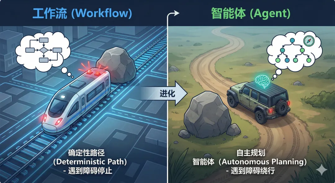 - 工作流 (Workflow):是确定的。像火车轨道,A 导致 B,B 导致 C。只要路径确定,就不是 Agent。
