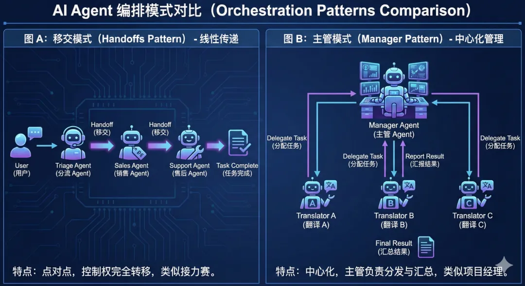 Manager Agent通过工具调用协调多个专业化Agent,每个Agent处理特定任务领域; - 去中心化(Agent移交Agent) - 多个Agent作为对等体运行,根据其专业化将任务移交给另一个