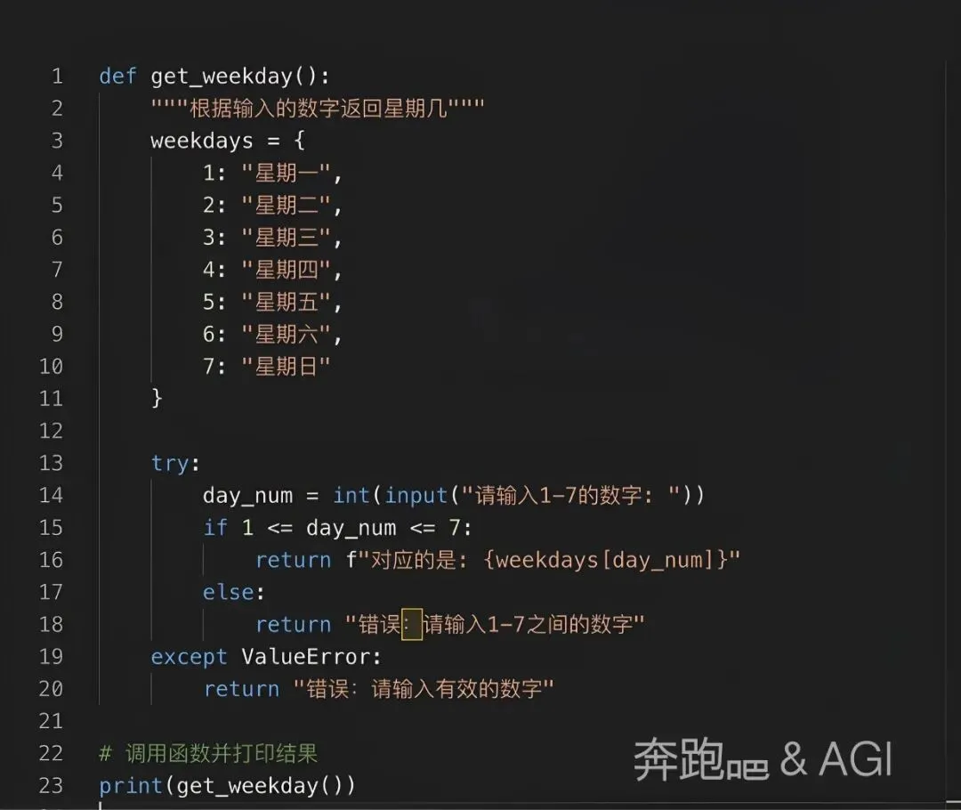 2.函数内部定义了一个字典weekdays,将数字1-7映射到对应的星期几。