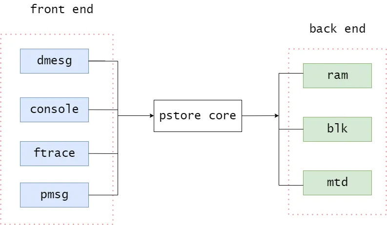 pstore最初是用于系统发生oops或panic时,自动保存内核log buffer中的日志。不过在当前内核版本中,其已经支持了更多的功能,如保存console日志、ftrace消息和用户空间日志。同时,它还支持将这些消息保存在不同的存储设备中,如内存、块设备或mtd设备。 为了提高灵活性和可扩展性,pstore将以上功能分别抽象为前端和后端,其中像dmesg、console等为pstore提供数据的模块称为前端,而内存设备、块设备等用于存储数据的模块称为后端,pstore core则分别为它们提供相关的注册接口。