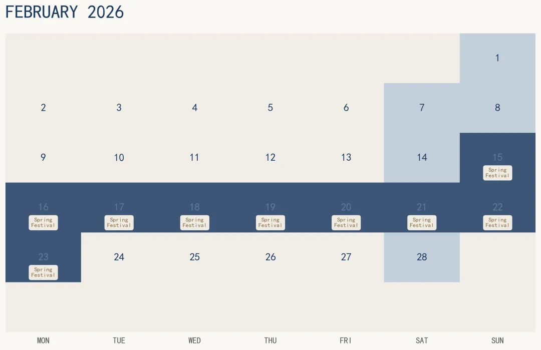 import matplotlib.pyplot as pltimport numpy as npfrom datetime import datetime, timedeltaplt.rcParams['font.sans-serif'] = ['SimHei'] # 设置为黑体def plot_month_heatmap(year, month, custom_holidays=None, title=None): """ 生成指定月份的假期热力图 参数: year: 年份 (int) month: 月份 (1-12) custom_holidays: 自定义节假日列表,格式 [(day, "名称"), ...] title: 自定义标题 (可选) """ # 默认节假日(可被custom_holidays覆盖) if custom_holidays is None: custom_holidays = [] # 创建日期矩阵 (6周×7天) first_day = datetime(year, month, 1) start_offset = first_day.weekday() # Monday=0, Sunday=6 days_in_month = (datetime(year, month + 1, 1) - timedelta(days=1)).day if month < 12 else 31 # 初始化矩阵: 0=工作日, 0.4=周末, 0.9=节假日 calendar = np.zeros((6, 7)) day_labels = np.full((6, 7), "", dtype=object) holiday_labels = {} # 填充日期和类型 for day in range(1, days_in_month + 1): date = datetime(year, month, day) pos = start_offset + day - 1 row, col = divmod(pos, 7) day_labels[row, col] = str(day) calendar[row, col] = 0.4 if date.weekday() >= 5 else 0.0 # 周末标记 # 标记自定义节假日 for day, name in custom_holidays: if 1 <= day <= days_in_month: pos = start_offset + day - 1 row, col = divmod(pos, 7) calendar[row, col] = 0.9 holiday_labels[(row, col)] = name # 创建图形 fig, ax = plt.subplots(figsize=(10, 6.5), dpi=120) fig.patch.set_facecolor('#FAF8F5') # 高级配色:灰白→浅灰蓝→深海军蓝 cmap = plt.cm.colors.LinearSegmentedColormap.from_list( "elegant", ['#F0EDE8', '#B8C8D9', '#1E3A5F'] ) ax.imshow(calendar, cmap=cmap, aspect='auto', vmin=0, vmax=1) # 绘制日期数字 for i in range(6): for j in range(7): if day_labels[i, j]: color = '#1E3A5F' if calendar[i, j] < 0.5 else '#5A7B9E' ax.text(j, i, day_labels[i, j], ha='center', va='center', fontsize=14, color=color, fontweight='medium') # 标注节假日名称 for (row, col), name in holiday_labels.items(): ax.text(col, row + 0.2, name, ha='center', va='top', fontsize=8, color='#8B6B42', fontweight='bold', bbox=dict(boxstyle='round,pad=0.4', facecolor='#F9F4E9', edgecolor='none', alpha=0.95)) # 设置坐标轴 weekdays = ['MON', 'TUE', 'WED', 'THU', 'FRI', 'SAT', 'SUN'] ax.set_xticks(range(7)) ax.set_xticklabels(weekdays, fontsize=11, color='#5A5A5A', fontweight='medium') ax.set_yticks([]) # 标题 month_name = first_day.strftime('%B').upper() ax.set_title(title or f'{month_name}{year}', fontsize=24, fontweight='light', color='#1E3A5F', pad=20, loc='left') # 美化 ax.set_xlim(-0.5, 6.5) ax.set_ylim(5.5, -0.5) for spine in ax.spines.values(): spine.set_visible(False) ax.tick_params(left=False, bottom=False) plt.tight_layout() plt.savefig(f'{year}_{month:02d}_heatmap.png', dpi=300, bbox_inches='tight', facecolor=fig.get_facecolor()) plt.show()# ============ 使用示例 ============# 示例1:2026年2月(含春节)plot_month_heatmap( year=2026, month=2, custom_holidays=[ (15, "Spring\nFestival"), (16, "Spring\nFestival"), (17, "Spring\nFestival"), (18, "Spring\nFestival"), (19, "Spring\nFestival"), (20, "Spring\nFestival"), (21, "Spring\nFestival"), (22, "Spring\nFestival"), (23, "Spring\nFestival") ], title="FEBRUARY 2026")