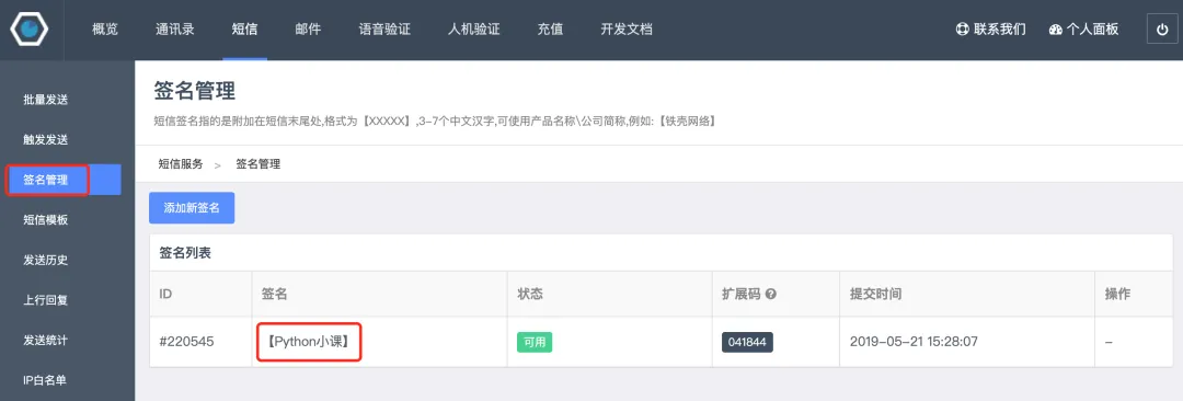 import randomimport requestsdefsend_message_by_luosimao(tel, message):"""发送短信(调用螺丝帽短信网关)""" resp = requests.post( url='http://sms-api.luosimao.com/v1/send.json', auth=('api', 'key-注册成功后平台分配的KEY'), data={'mobile': tel,'message': message }, timeout=10, verify=False )return resp.json()defgen_mobile_code(length=6):"""生成指定长度的手机验证码"""return''.join(random.choices('0123456789', k=length))defmain(): code = gen_mobile_code() message = f'您的短信验证码是{code},打死也不能告诉别人哟!【Python小课】'print(send_message_by_luosimao('13500112233', message))if __name__ == '__main__': main()
