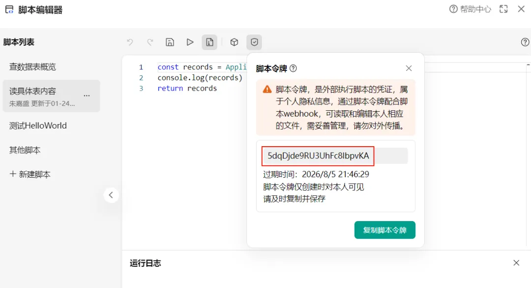 再次强调数据安全的重要性。我目前使用的脚本令牌(APIToken)和 AirScript 脚本的 WebHook 链接地址都仅用于示例测试,对于你自己的真实数据,这些信息绝对不可泄露。