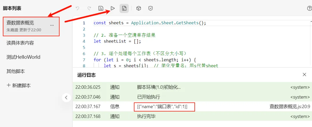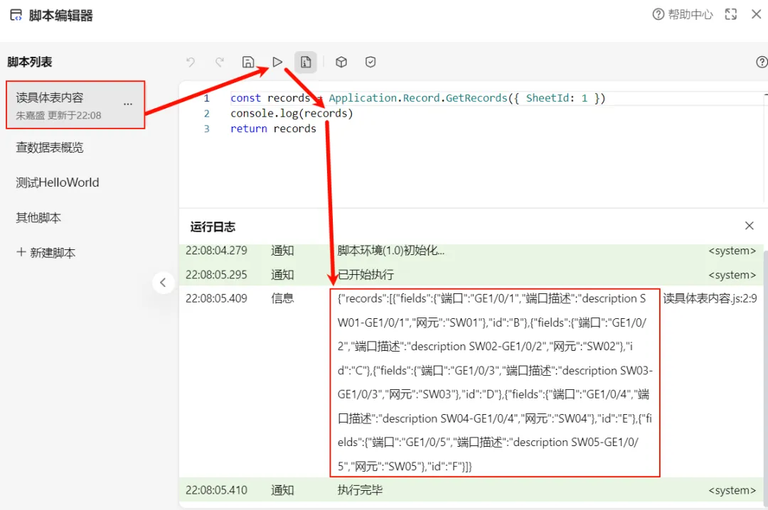 const records = Application.Record.GetRecords({ SheetId: 1 })console.log(records)return records我们在 WPS 上直接测试脚本: