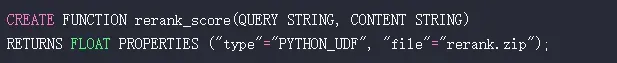 你可以把自研的 Rerank 模型打包成 .zip,注册为函数,直接在 SQL 里调用!