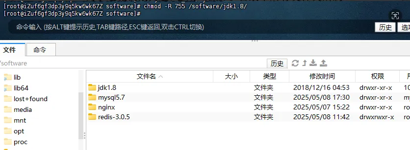 为了避免权限问题,更改jdk1.8 目录下所有文件夹所属的权限。chmod -R 755 /software/jdk1.8/