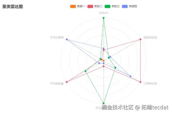 我们将889个渠道聚类为4类,通过雷达图直观呈现各类渠道特征: