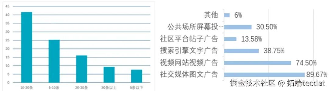 用户每天接触10条以上在线广告的比例接近70%,其中10-20条的占比最高(41.67%),说明用户日常被广告高频触达,广告竞争激烈。