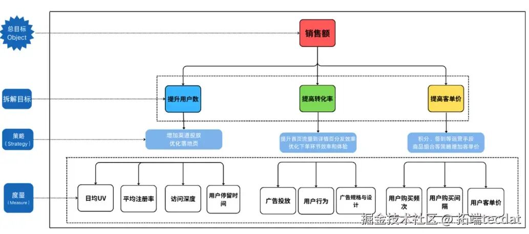 基于OSM模型搭建渠道质量评估体系,明确以销售额为核心目标,拆解为流量、转化、用户参与度三大维度指标,为渠道分析提供框架支撑。