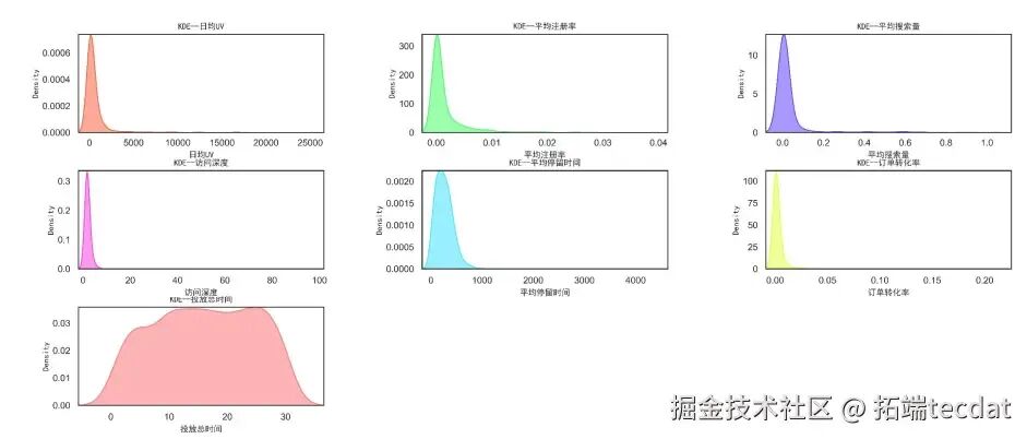 OSM模型将业务目标(O)、策略(S)、指标(M)层层拆解,确保每个指标都与核心目标强相关,避免“指标泛滥”导致的分析偏差。通过KDE核密度分析发现,广告投放总时间分布均匀,而日均UV、订单转化率等指标呈极度偏态分布——75%的渠道日均UV低于466.87,最高却达25294.77,说明渠道流量差异极大,存在“少数超级渠道垄断流量”的现象。