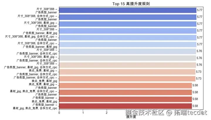 核心发现:banner广告+308388尺寸(提升度>5.7)、免费卖点+jpg素材+CPC合作方式的组合效果最优;信息流广告搭配视频素材+60090尺寸关联性强,这些组合可直接应用于广告制作与投放。