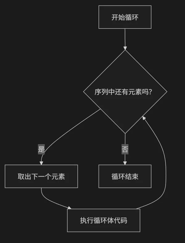 for循环:适用于已知迭代次数的场景,通常用于遍历序列。
