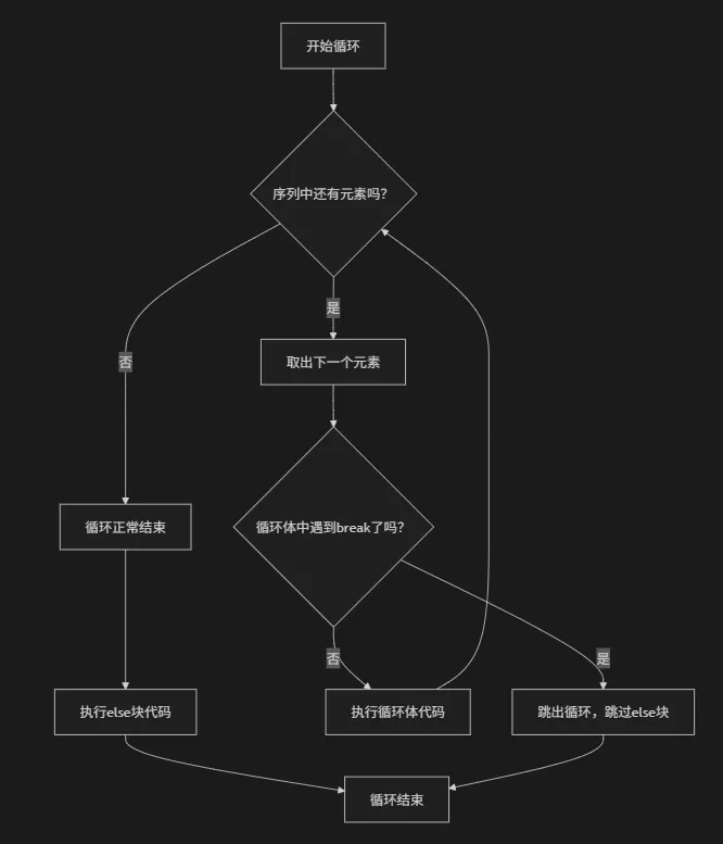 for 变量 in 可迭代对象: # 循环体代码块 # 如果循环中没有遇到 break 语句,则执行 else 块else: # 循环正常结束后执行的代码