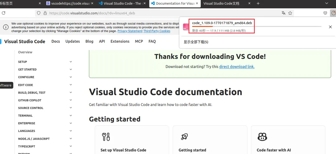 前往 VSCode 官网 下载 .deb 安装包,下载地址为:https://code.visualstudio.com/Download,如下: