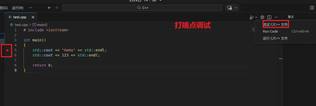 • 前提条件:使用 gdb 调试前,必须在编译时加上 -g 参数(例如 g++ -g main.cpp -o main)来保留源代码的符号表信息。