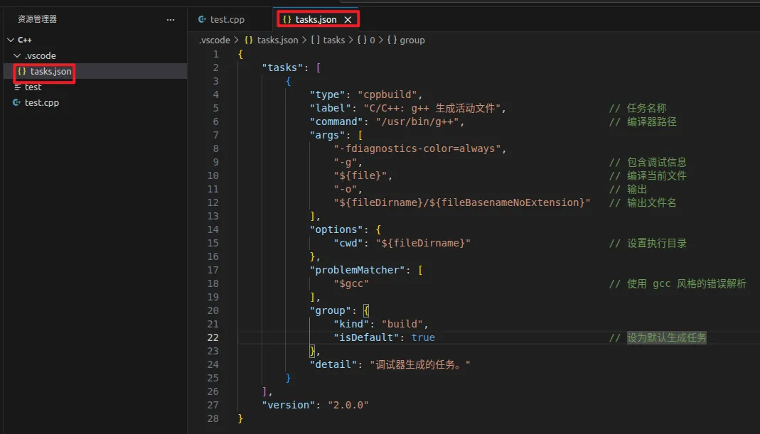 下面是自动生成的tasks.json文件,如下。tasks.json 就是一份“编译说明书”。它告诉 VSCode:“每当我点编译时,请帮我运行 g++ 命令,带上这几个参数,并把生成的程序放在这个地方。