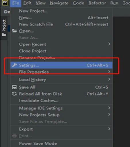 打开Pycharm,点击左上角File,选中settings
