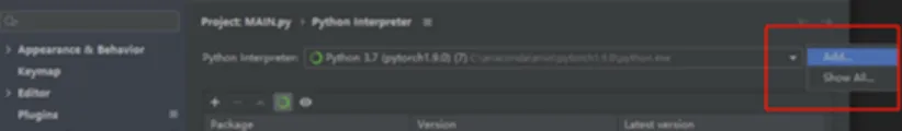 选择Python Interpreter,点击左边齿轮图标,并选择Add