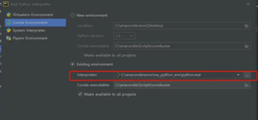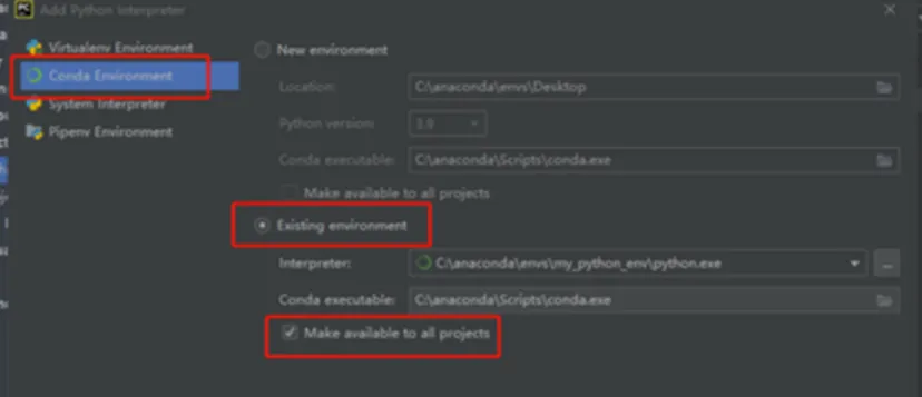 选Conda Environment,选Existing environment,并勾选Make available to all projects