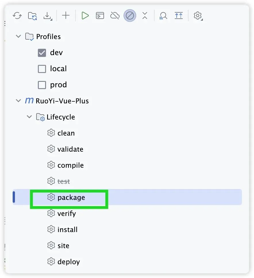 mvn clean package -Dmaven.test.skip=true -P prodIDEA 打包方法:点击右侧 Maven 栏 → 生命周期 →