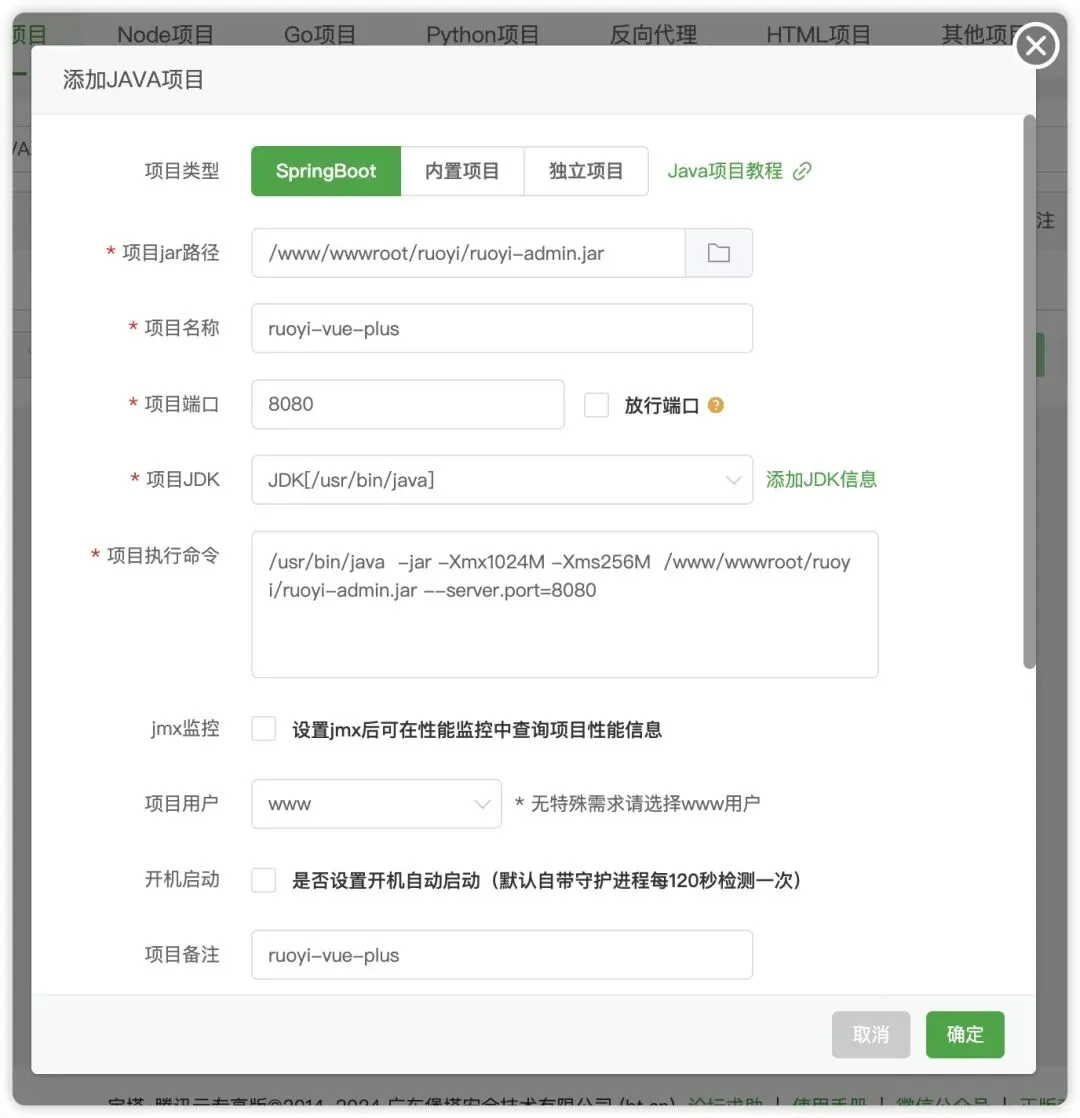 ✅方式二:宝塔面板运行登录宝塔 → 网站 → Java项目 → 添加 Java 项目 → 选择Spring Boot勾选“前后端分离”,填写 jar 路径和运行参数: