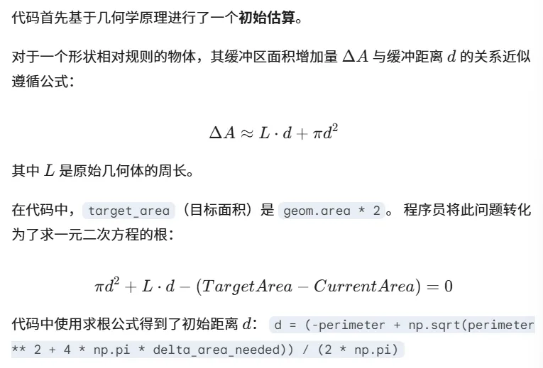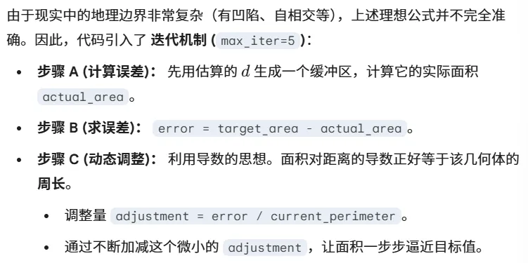 2.利用Python对不规则多边形建立等面积缓冲区的实现代码:import geopandas as gpdimport numpy as npimport os# 1. 配置路径input_path = r"F:\Desktop\示例数据\示例数据.shp"output_dir = r"F:\Desktop\示例数据"output_path = os.path.join(output_dir, "示例数据等积缓冲区.shp")def get_refined_buffer(geom, target_area, max_iter=5, tolerance=0.001):current_area = geom.areaif current_area <= 0:return geom# 初始估算距离 d (基于二次方程)perimeter = geom.lengthdelta_area_needed = target_area - current_aread = (-perimeter + np.sqrt(perimeter ** 2 + 4 * np.pi * delta_area_needed)) / (2 * np.pi)for i in range(max_iter):buffered_geom = geom.buffer(d)actual_area = buffered_geom.areaerror = target_area - actual_area# 如果误差在允许范围内(例如小于 1 平方米),则停止if abs(error) < tolerance:return buffered_geom# 动态调整距离:根据当前周长近似调整# 导数近似于当前缓冲后的周长current_perimeter = buffered_geom.lengthif current_perimeter == 0: breakadjustment = error / current_perimeterd += adjustmentreturn geom.buffer(d)def process_equal_area_buffer(gdf, factor=2):results = gdf.copy()new_geoms = []print("开始精确迭代计算...")for index, row in gdf.iterrows():geom = row['geometry']target = geom.area * factor# 执行迭代修正refined_geom = get_refined_buffer(geom, target)new_geoms.append(refined_geom)if index % 50 == 0 and index > 0:print(f"已处理 {index} 个城市...")results['geometry'] = new_geoms# 计算新面积 NArea (单位:平方千米),并保留 6 位小数# 注意:这里计算的是最终几何体的实际面积results['NArea'] = (results['geometry'].area / 1_000_000).round(6)return resultstry:# 读取数据city_gdf = gpd.read_file(input_path)# 执行处理final_gdf = process_equal_area_buffer(city_gdf, 2)# 设置输出 Schema,防止 NArea 写入失败input_schema = gpd.io.file.infer_schema(city_gdf)output_schema = input_schema.copy()output_schema['properties']['NArea'] = 'float:24.6'# 保存结果print("正在写入文件,请稍候...")final_gdf.to_file(output_path,driver='ESRI Shapefile',encoding='utf-8',schema=output_schema,engine='fiona')print(f"✅ 处理成功!结果已保存至: {output_path}")print(f"统计:计算得到的 NArea 均值约为 {final_gdf['NArea'].mean():.4f} km²")except Exception as e:print(f"❌ 运行出错: {e}")