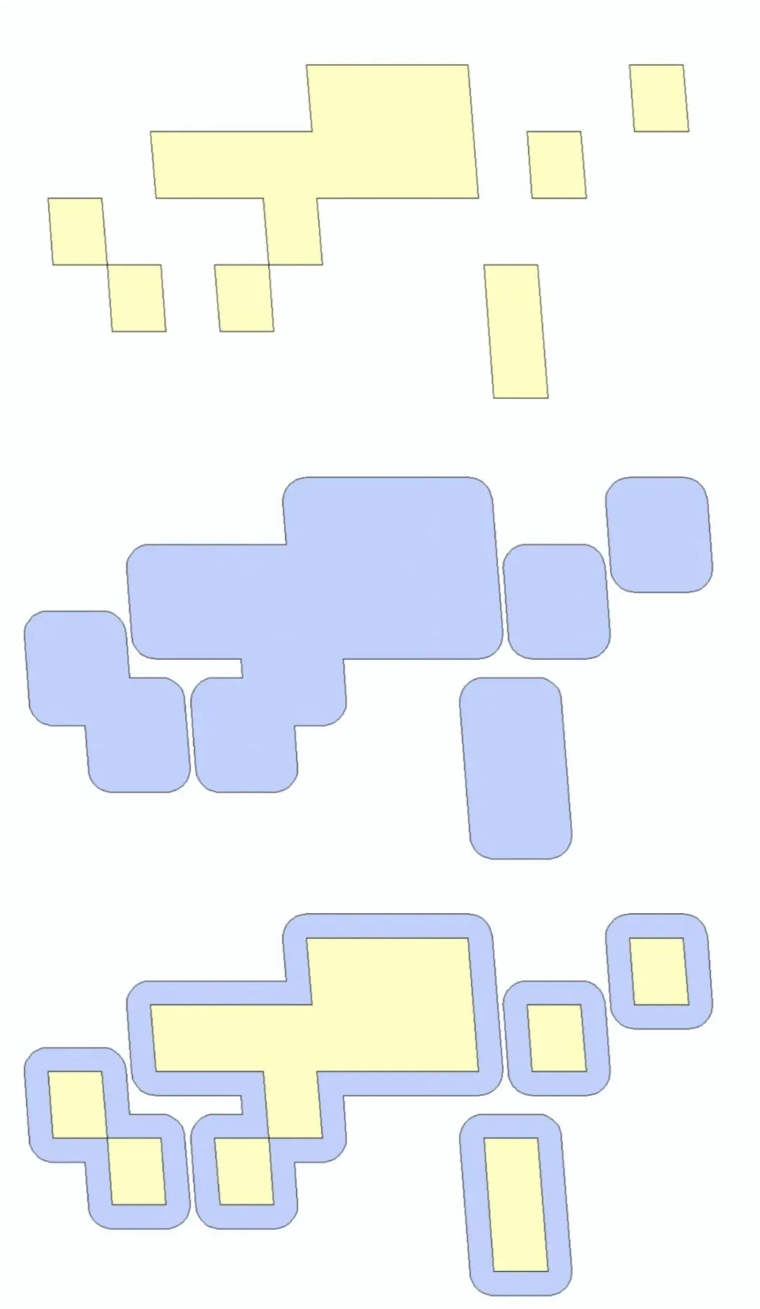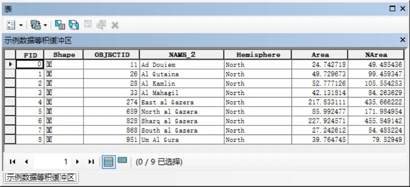 图中黄色区域为示例数据(局部),蓝色区域为示例数据的等面积缓冲区,蓝色区域的面积(NArea)为黄色区域面积的2倍(Area)。