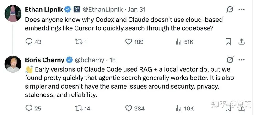 如果我们接受这个说法,这意味着在编程及相关任务中,工具调用比 RAG 更有效。但我对某些细分场景(如超大规模代码库、跨多个代码库协作等)仍持保留意见。