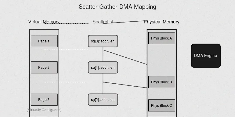 Scatter-Gather DMA 则像是一支拥有多辆卡车的运输车队,单次 DMA 传输可以处理多个物理上不连续的内存区域。这些不连续的内存区域通过一个链表来描述,DMA 控制器得到链表首地址后,会根据链表的指引,依次传输下一块物理上连续的数据,直到所有数据传输完毕。这种传输模式的出现,主要是为了应对现代计算机系统中内存碎片化的问题。随着系统的运行,内存会被频繁地分配和释放,导致内存空间变得碎片化,很难找到大块连续的内存区域。而 Scatter-Gather DMA 能够将分散在不同内存区域的数据,通过链表组织起来,一次性完成传输,大大提高了数据传输的效率。