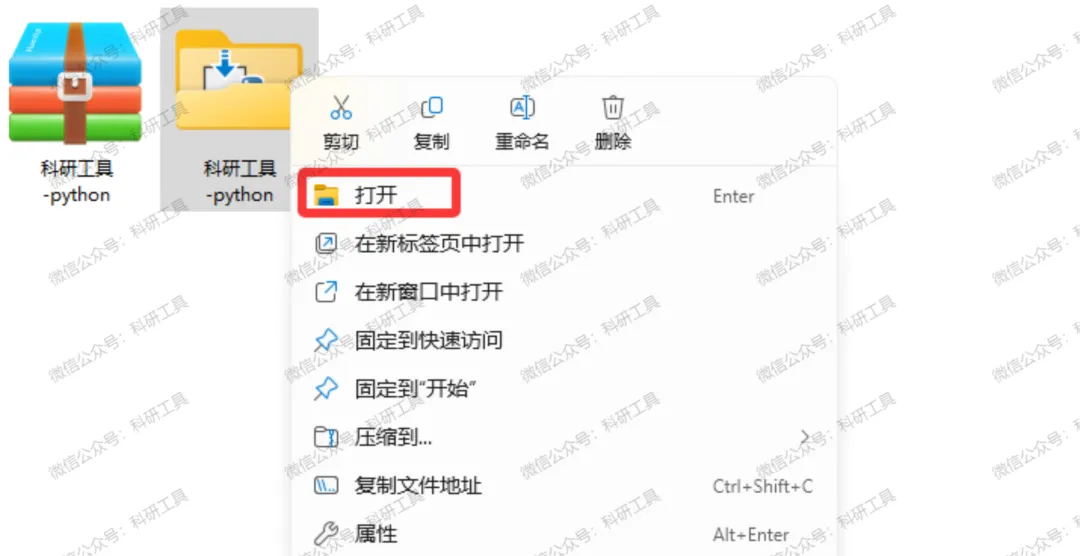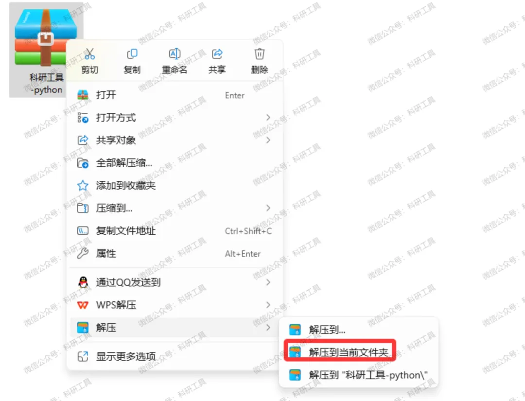 1️⃣ 下载「科研工具-Python」压缩包至电脑本地,右键选择「解压到当前文件夹」;