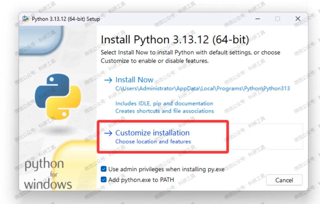 4️⃣ ⚠️ 关键步骤:✅ 勾选 "Use admin privileges when installing py.exe"(使用管理员权限安装)✅ 勾选 "Add python.exe to PATH"(添加到系统环境变量)🖱️ 点击 "Customize installation"(自定义安装);