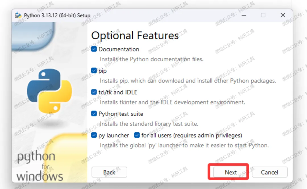 5️⃣ 在 Optional Features 页面,保持默认勾选,点击 "Next";