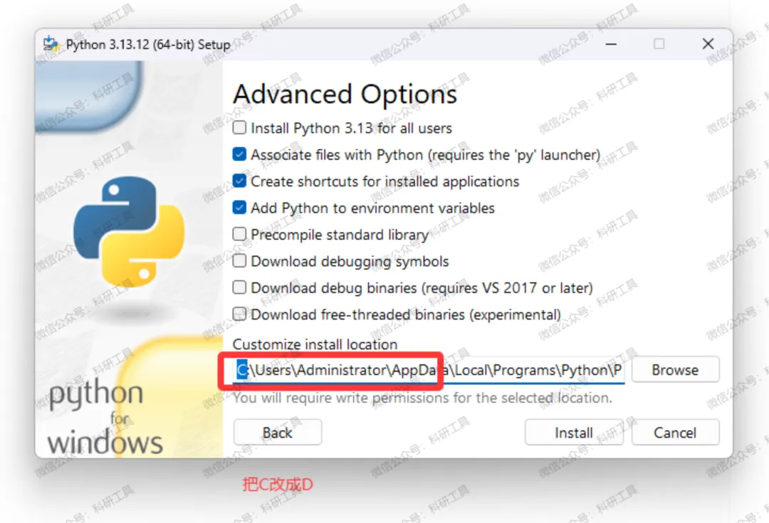 6️⃣ 📂 修改安装路径:找到路径地址,将首字符「C」改为「D」(或其他盘符),不建议安装在 C 盘;🖱️ 点击 "Install" 开始安装;