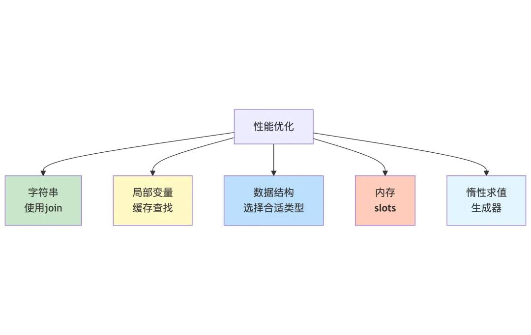 # 不好的写法:频繁全局查找defprocess():for i in range(10000): result = math.sqrt(i) # math是全局变量return result# 好的写法:使用局部变量defprocess(): sqrt = math.sqrt # 局部引用for i in range(10000): result = sqrt(i)return result