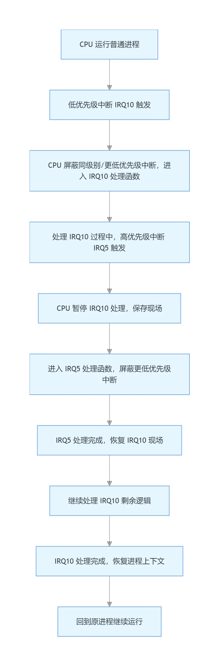 场景:网卡中断(高优先级)嵌套UART中断(低优先级) 1. CPU执行UART硬中断处理函数(低优先级)2. 网卡产生硬中断(高优先级)→ GIC判定优先级更高 → 暂停UART中断3. 执行网卡硬中断处理函数(清中断、触发NET_RX软中断)4. 网卡硬中断执行完 → 回到UART硬中断继续执行 5. UART硬中断执行完 → 触发软中断处理(网卡数据+UART数