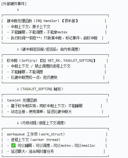 硬件中断(最快、不能睡) → 软中断(稍慢、仍不能睡) → tasklet(更慢、仍不能睡) → workqueue(最慢、可以随便睡)