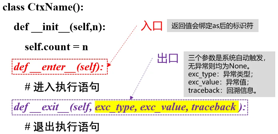 为了支持上下文管理,类定义时必须使用 __enter__() 、 __exit__() 两个魔术方法,它们分别负责上下文的进入和退出。通常,对文件、数据库、网络连接等操作都支持上下文管理。支持上下文管理器的类,结构如下: