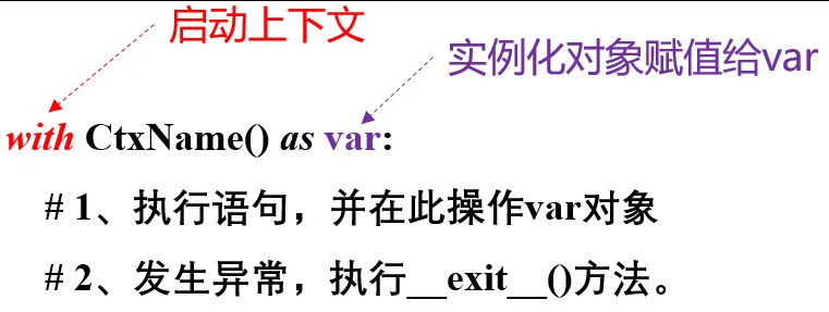 有了支持上下文管理的类之后,我们需要用 with 关键字启动类,并用 as 将例化对象值赋给实关键字。 with 语句结构如下: