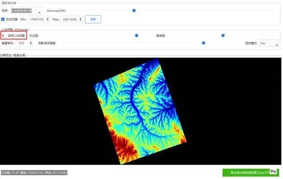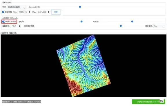 平面地图不够看?独家内置的Hillshade(山体阴影)算法,让你能够自由调节太阳的方位角和高度角。