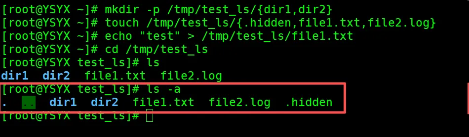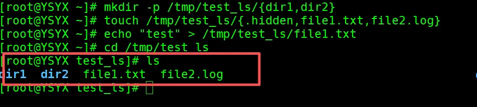mkdir -p /tmp/test_ls/{dir1,dir2}touch /tmp/test_ls/{.hidden,file1.txt,file2.log}echo "test" > /tmp/test_ls/file1.txt