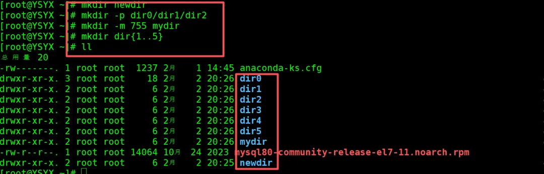mkdir newdir # 创建单个目录mkdir -p dir0/dir1/dir2 # 递归创建多级目录mkdir -m 755 mydir # 创建时指定权限mkdir dir{1..5} # 批量创建目录