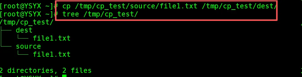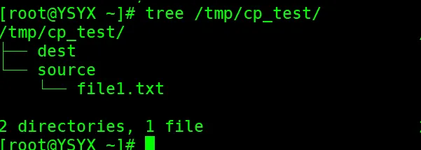 # 创建测试环境mkdir -p /tmp/cp_test/{source,dest}echo "original" > /tmp/cp_test/source/file1.txtyum -y install tree #安装tree命令,作用以递归模式展示目录tree /tmp/cp_test