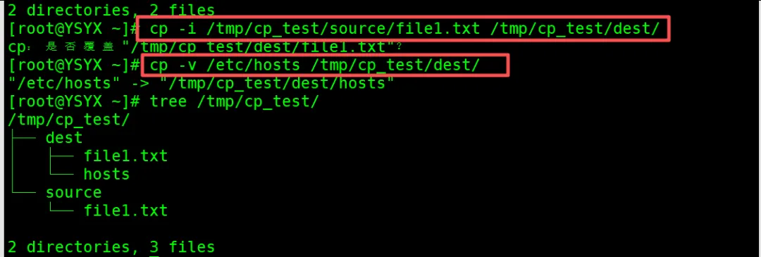 # 复制实验cp /tmp/cp_test/source/file1.txt /tmp/cp_test/dest/cp -i /tmp/cp_test/source/file1.txt /tmp/cp_test/dest/ # 尝试重复复制cp -v /etc/hosts /tmp/cp_test/dest/