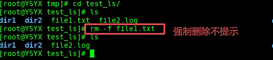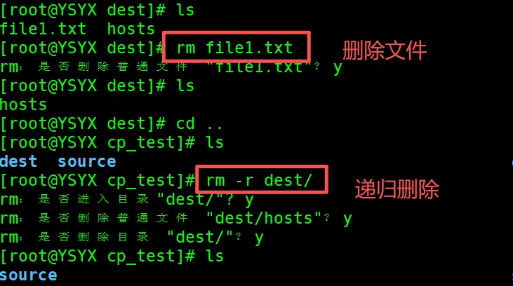 rm file.txt # 删除文件rm -r directory # 递归删除目录rm -f file # 强制删除(不提示)rm -rf /tmp/test/* # 强制递归删除(慎用!)rm -i *.txt # 删除前逐一确认