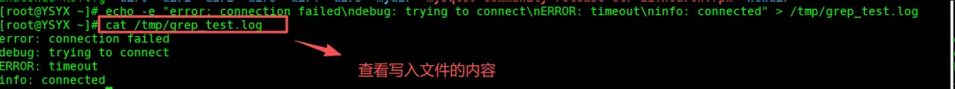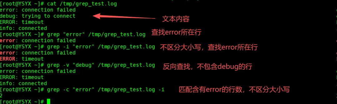 # 准备测试文件echo -e "error: connection failed\ndebug: trying to connect\nERROR: timeout\ninfo: connected" > /tmp/grep_test.log