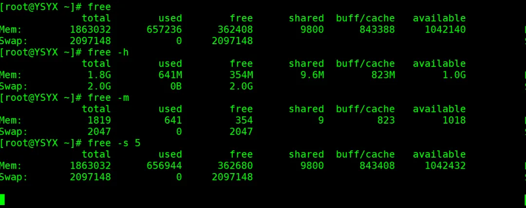 free # 显示内存使用free -h# 人性化显示(单位K/M/G)free -m# 以MB为单位free -s 5# 每5秒刷新一次