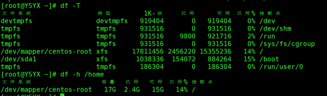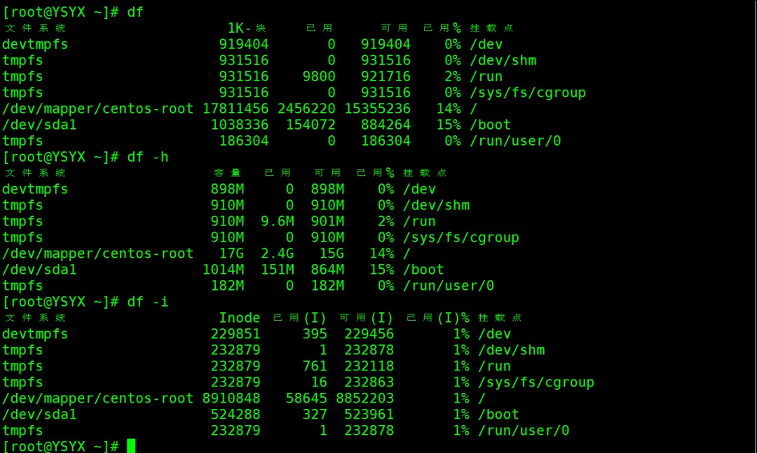 df # 显示磁盘使用情况df -h# 人性化显示df -i# 显示inode使用情况df -T# 显示文件系统类型df -h /home # 查看指定目录所在分区